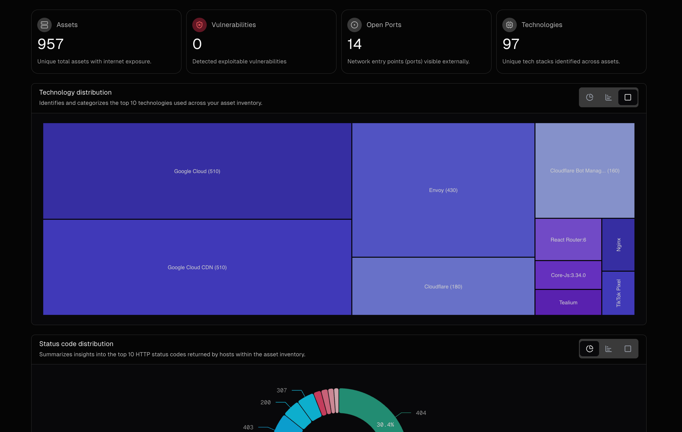Asset overview (early version): View your data in different ways with our new multi-format visualization feature, giving you flexibility in how you explore your infrastructure’s exposure, such as detected ports and technologies. This early version is just the beginning, with more data points, visualizations, and improvements coming soon.