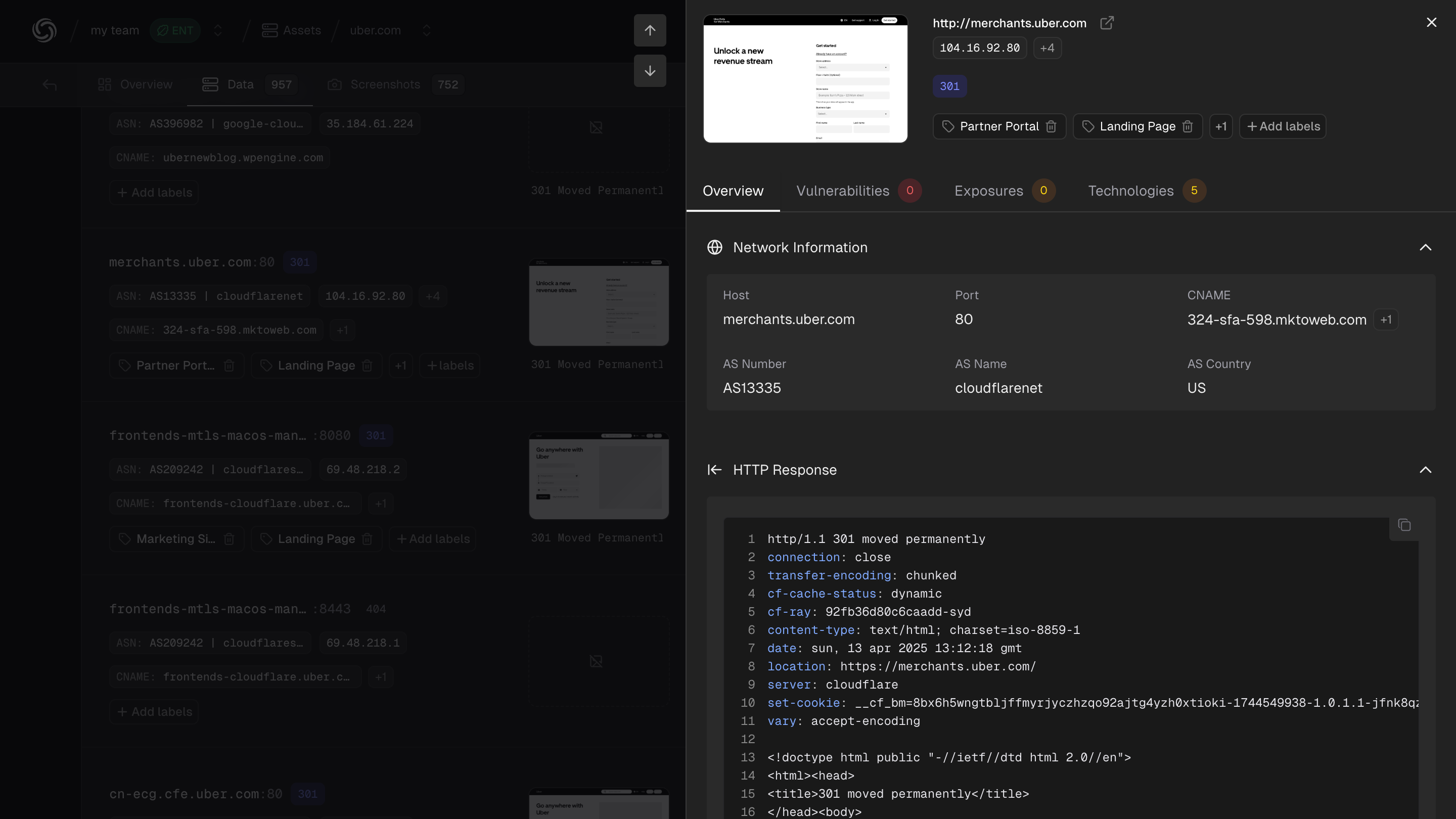 Asset host view: View detailed host-level information such as response headers, network information, and certificate information by clicking on each asset