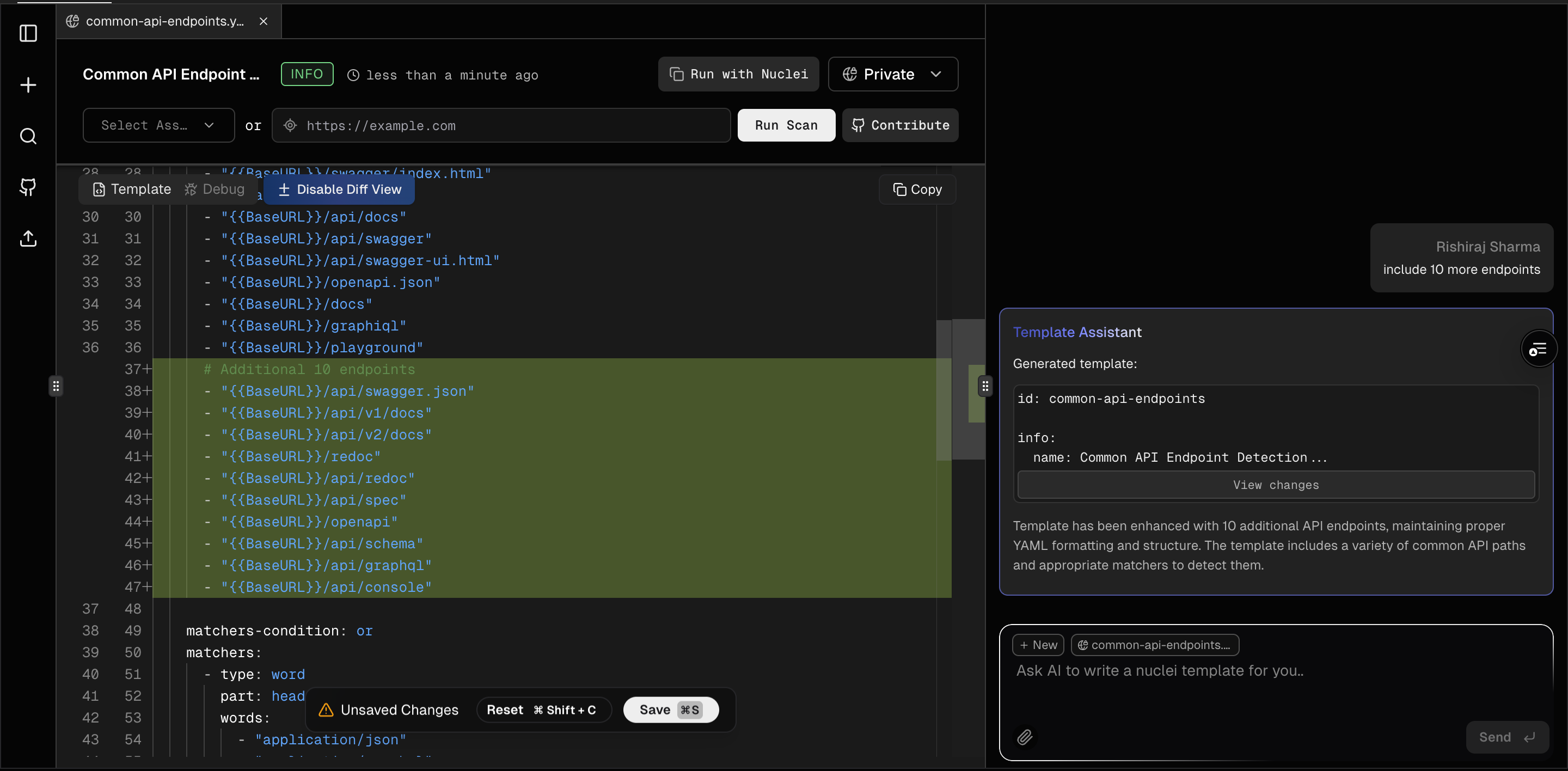 When we first launched the ProjectDiscovery Cloud Platform, it was centered around our Nuclei template editor, powered by OpenAI APIs and several internal tools to handle lint errors and ensure accuracy with the Nuclei schema. Today, we’re releasing the second major update to this interface, with a primary focus on making iterative editing faster and smoother. The editor now includes integrated chat, enabling a real-time, interactive conversation with the AI editor while editing templates. This allows for a more dynamic and efficient editing experience. We’ve also added support for attaching images directly within the editor, simplifying your template development and debugging process.